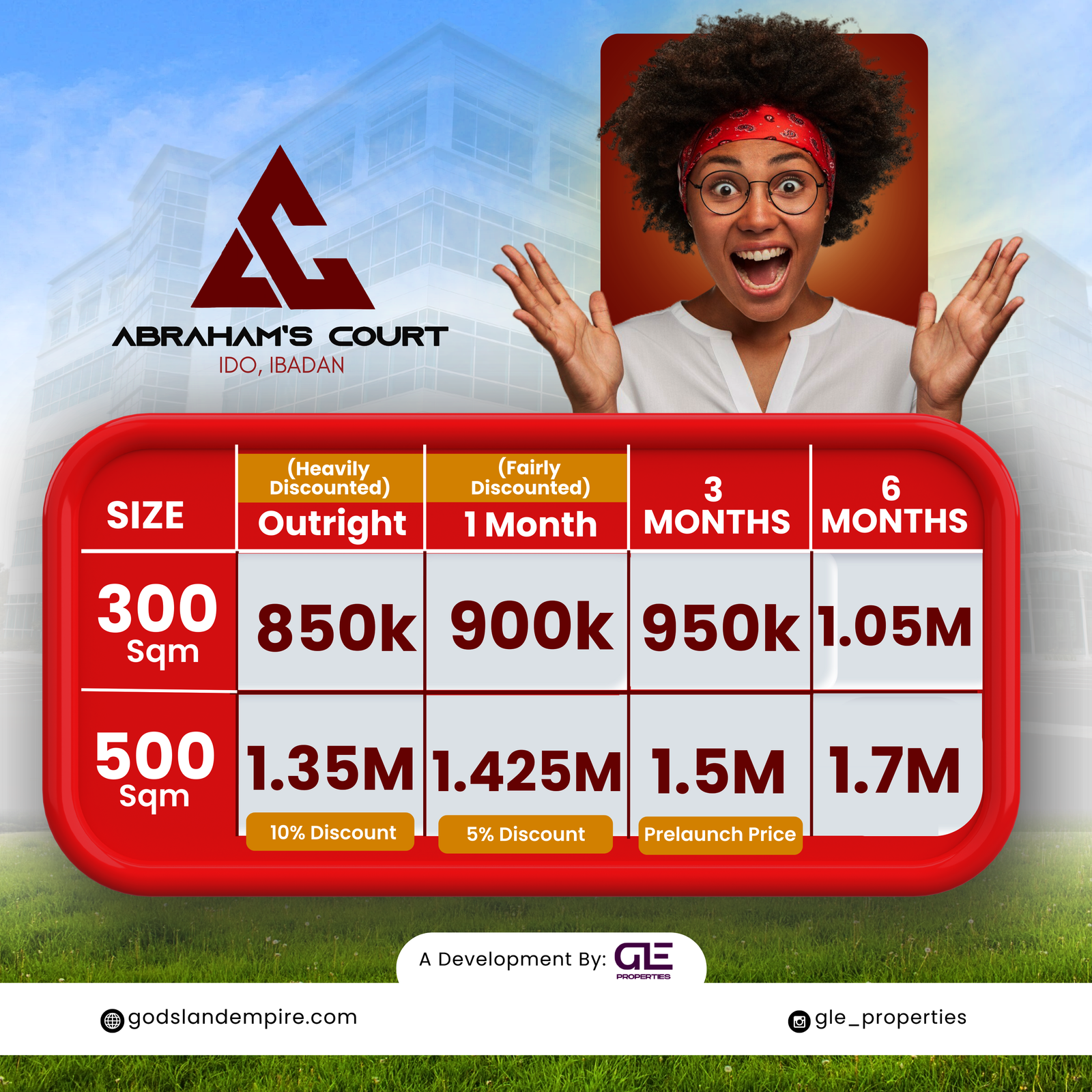 Many land sellers in Ibadan, like GLE Properties, now offer flexible payment options to help more people buy property. This is one of the reason why you NEED to key into Abraham’s Court, Ido. We let you:
